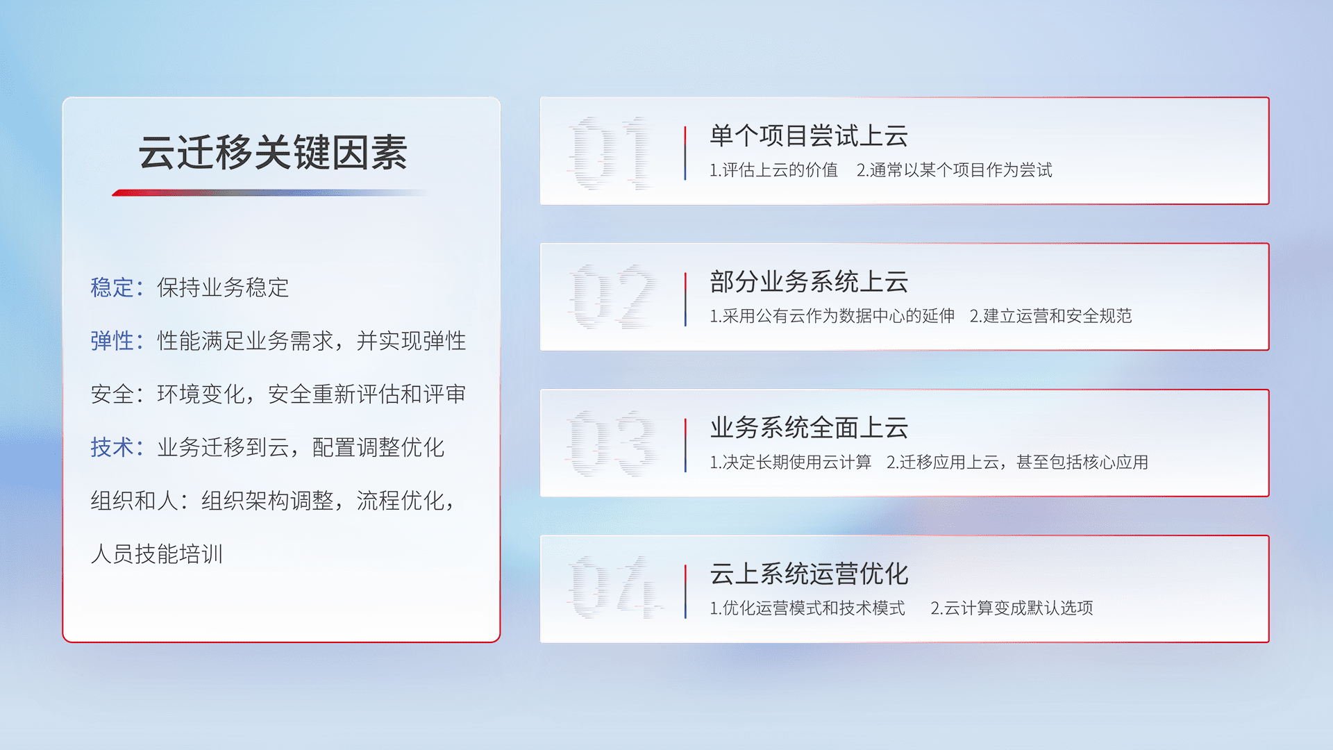 结合实际业务,,从规划设计、、云平台选型、、云原生改造、、数据迁移、、集成交付,,,迁移全过程为客户识别最佳上云路径,,,做好风险识别管理,,设计网络架构、、、、身份权限、、安全审计合规、、、、操作审计、、日志审计、、监控告警策略、、、多站点容灾设计等,,对云上基础设施进行整体规划,,,,提升IT治理水平,,以满足弹性、、、、高可用、、、高性能的需求。。。。